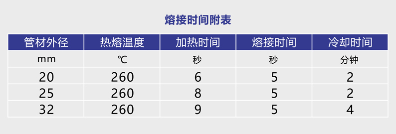 將熱熔器加熱至260℃(請注意嚴禁超過265 ℃),迅速將水管及接頭無旋轉(zhuǎn)地同時推入熱熔頭加熱,熱熔時間見附表。